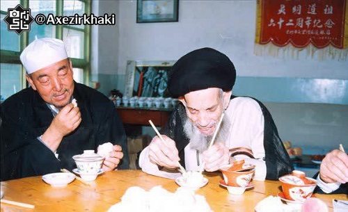 تصویر علامه سید مرتضی عسکری رحمه الله تعالی در سفری به چین و در جمع مسلمانان و غذا خوردن او به سبک چینی!